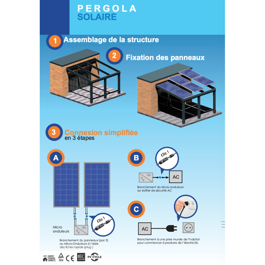 Les panneaux photovoltaïques (capteurs PV) transforment le rayonnement du soleil ( énergie gratuite ) en électricité. Nos auvents, carports et pergolas sont conçus pour s’adapter à cette technologie haut de gamme.