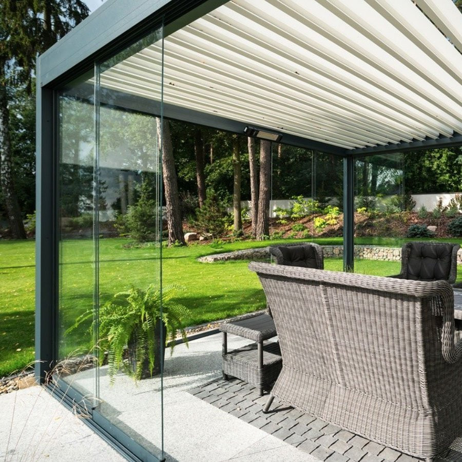 Vous pouvez aussi installer des capteurs pour toutes sortes d’informations, comme la température, le vent, et également rendre votre pergola bioclimatique exploitable le soir avec l’installation de lumières à LED. Si vous souhaitez rendre votre pergola bioclimatique encore plus haut de gamme vous pouvez opter pour les panneaux vitrés et les vitrages coulissants ainsi que les stores verticaux. Parmi ses petits plus, le pilotage de votre sonorisation via votre smartphone et grâce à des enceintes intégrées dans l’ensemble des panneaux de la pergola.