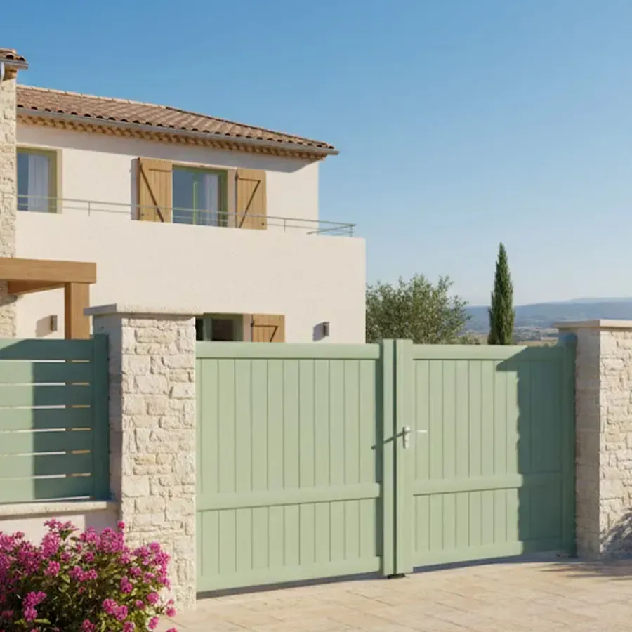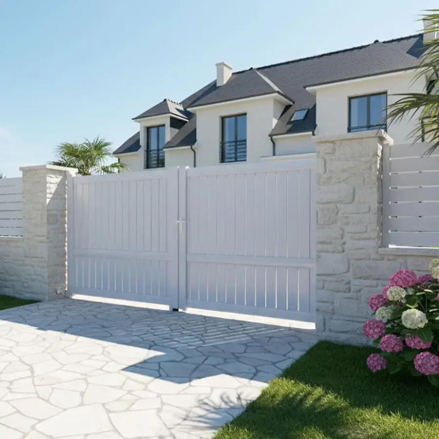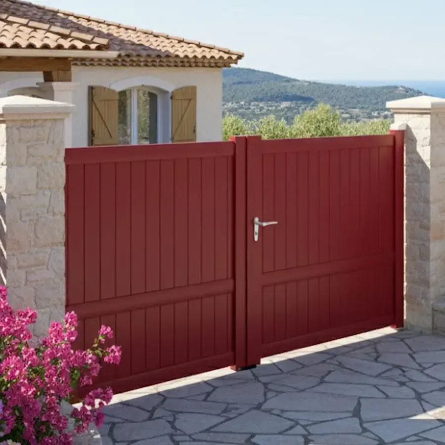 Chez nous le Portail 2 Vantaux est réalisé sur mesures précises, au prix du standard, avec une qualité de fabrication haut de gamme. Tout en profilés aluminium avec une finition soignée le portail à 2 vantaux battant modèle MEL vous attends. Le procédé de laquage est certifié par les labels : QUALICOAT et QUALIMARINE. Les exigences Européennes en termes de développement durable sont respecter en utilisant des laques sans chrome.
