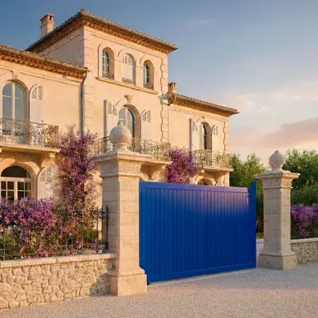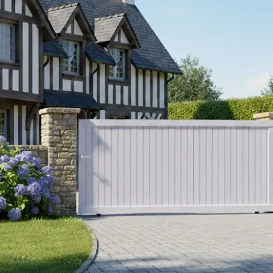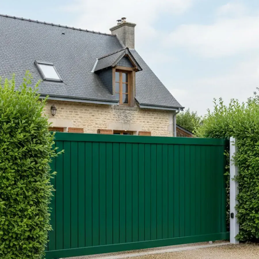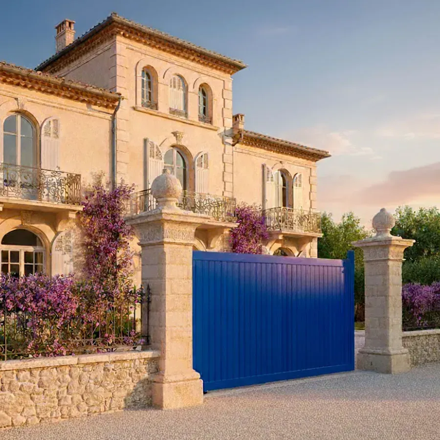 Le Portail Coulissant, style classique, tout en aluminium modèle NATI est entièrement plein sur toute sa hauteur et allie solidité et pare vue. Visuellement caché des regards indiscrets il est un atout important à votre propriété. L’aluminium garantissant sa longévité, il ne nécessite aucun entretien. Le procédé de thermo laquage est certifié par les meilleurs labels : QUALICOAT et QUALIMARINE. Les exigences Européennes en termes de développement durable sont respecter en utilisant des laques sans chrome.
