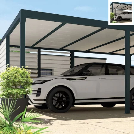 Carport abri voiture à toit plat isolant et étanche composée d''une ossature tout en aluminium 100% recyclable et d'une toiture en panneaux isolants 32 mm à 2 faces tôle aluminium.