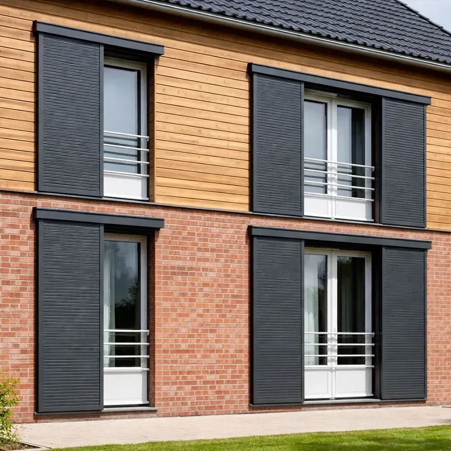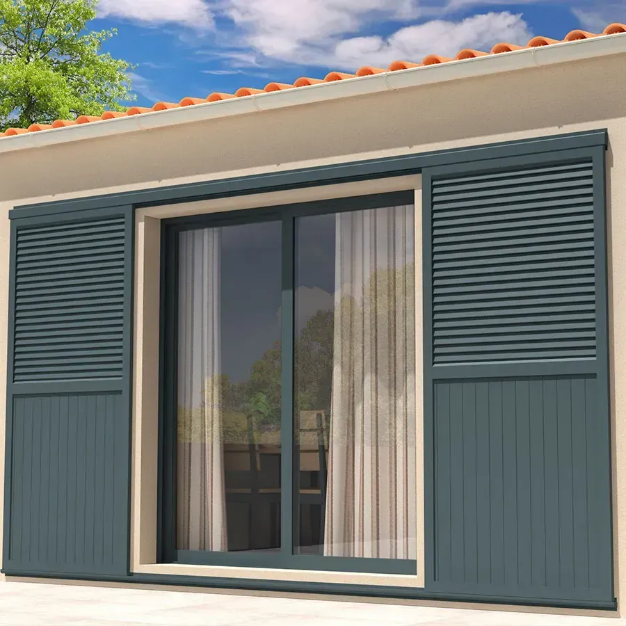 Volet coulissant aluminium avec lames verticales en bas et lames persiennées en partie haute appelé mixte.