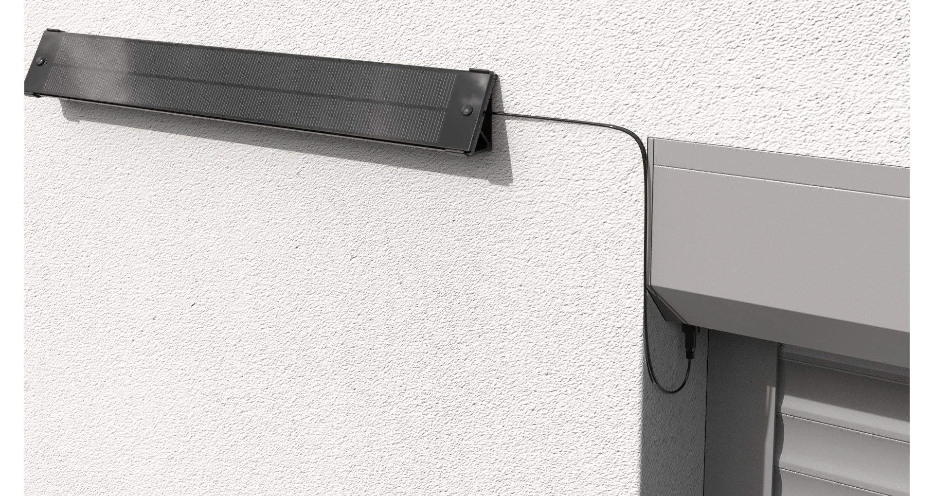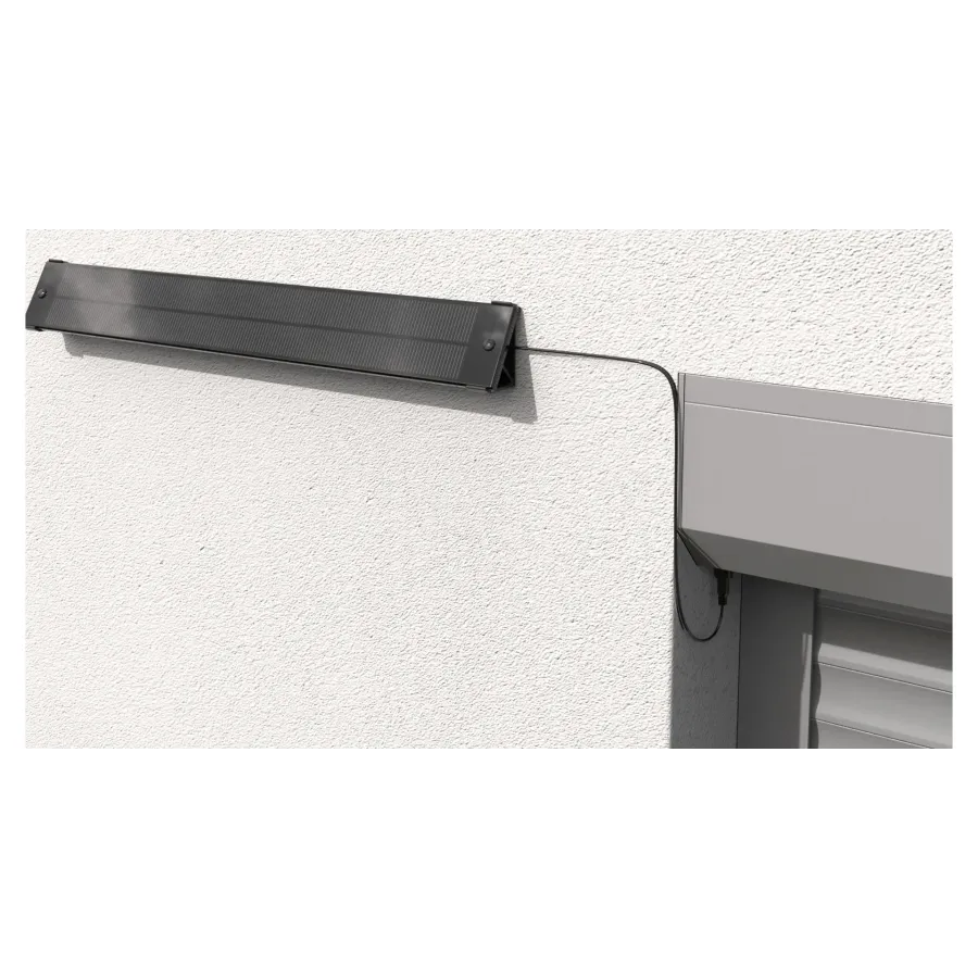 Les panneaux solaires peuvent être en pose déportée au mur avec 2 supports muraux Somfy pour inclinaison de 15°. Le câble, de couleur noire, part du dessous du coffre pour rejoindre le panneau.