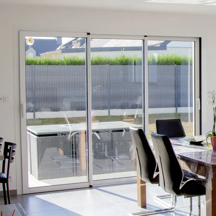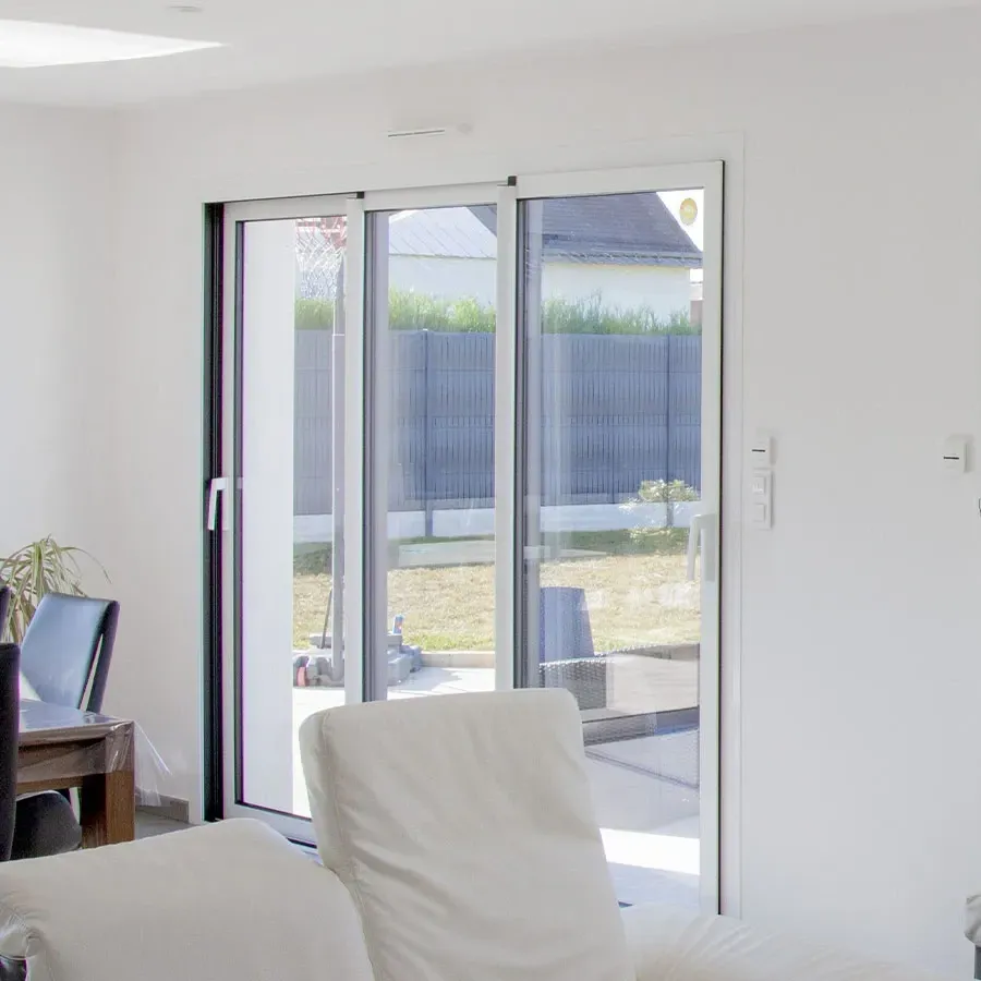 Type d'ouverture Baie Coulissante: en vue intérieure vous aurez les 2 vantaux de droite qui coulissent vers la gauche et le vantail de gauche qui coulisse vers la droite, le tout sur 3 rails.
