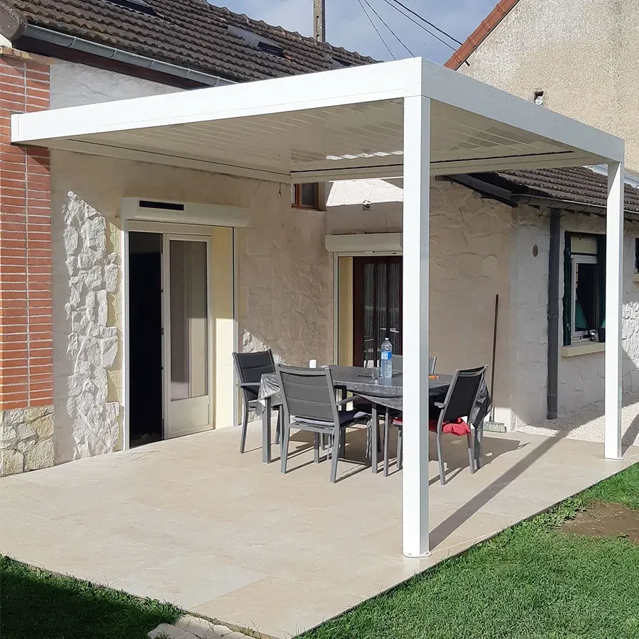 Vous avez un très beau jardin mais il vous manque un espace de repos : la solution est chez Fermeture Online : la Pergola Bioclimatique Horizon 2 adossée à votre mur de maison en pose murale.